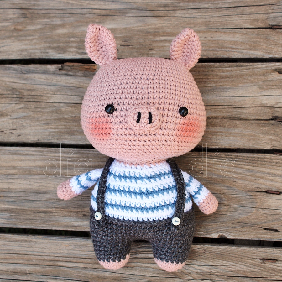 Este cerdito, que está en todo, aquí viene bien vestido con su pantalón con tirantes y camiseta:
