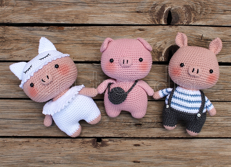 Mientras fui haciendo estos cerditos, me imaginé que se trataba de los tres cerditos del cuento infantil. Y es que cada uno tiene unos detalles distintos que me hicieron relacionarlos con cada uno de los personajes del cuento.