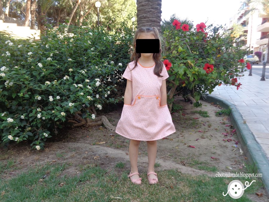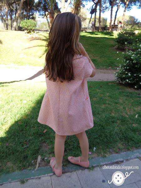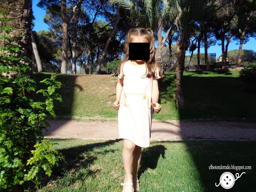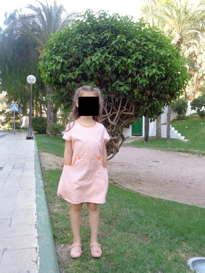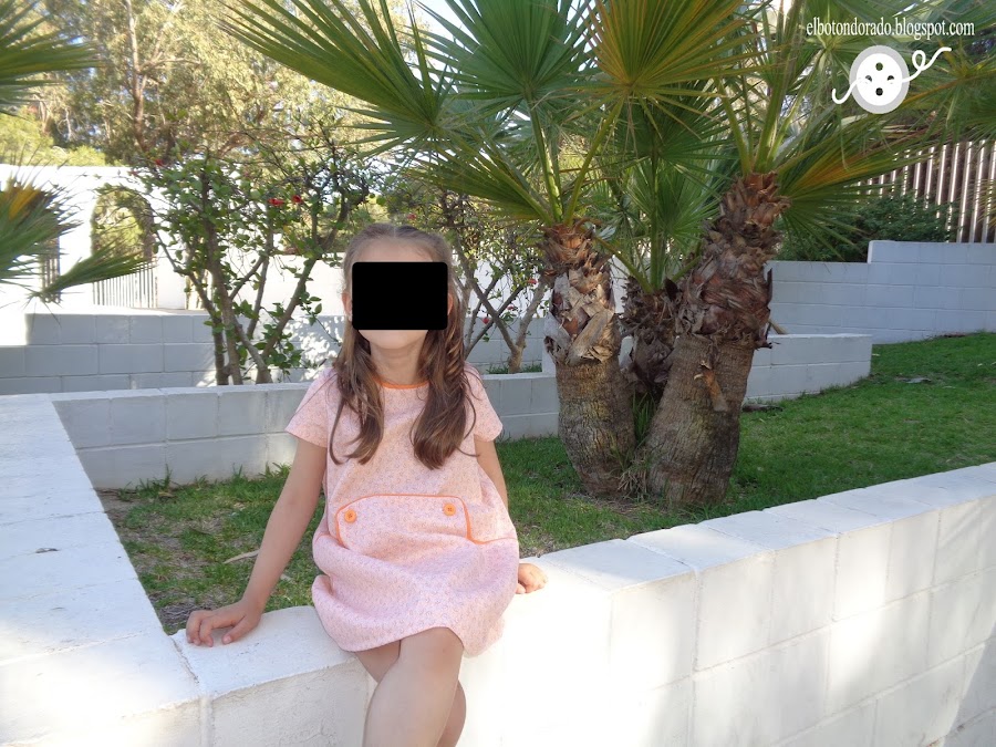 Cuando vino del cole y se lo probó le encantó, por los bolsillos como ya he comentado y por los botones. Ahora cuando le digo ¿qué vestido te quieres poner? me dice ¡el naranja!