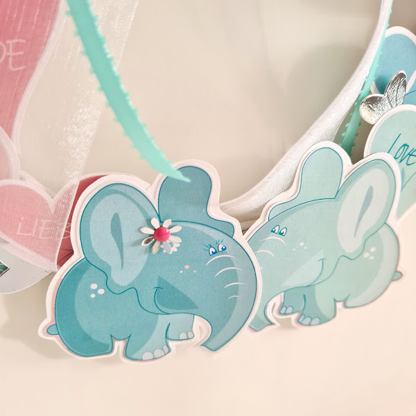 Un lazo en la parte de arriba para colgar y esos dos elefantes enamorados en la parte inferior derrochando amor.
