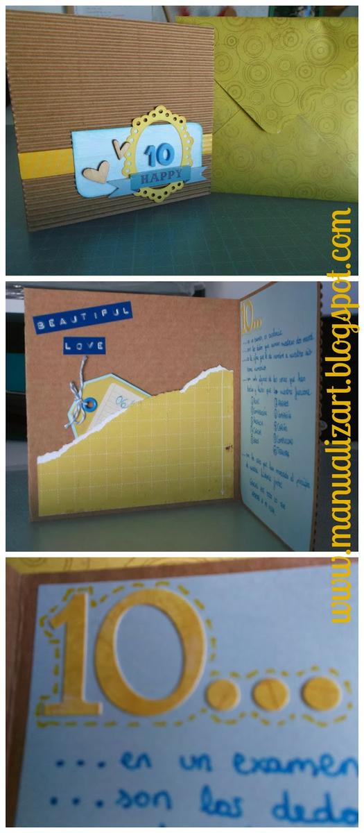 Y la segunda, es la tarjeta que le regalé a mi chico con motivo de nuestro décimo aniversario. Está hecha con cartón ondulado marrón, sobre el cual he ido colocando los distintos elementos que la decoran. La mayoría de ellos están realizados con restos de papeles de distintas colecciones, además de algunos adornos de madera, troqueles que he ido recibiendo en intercambios, washi tape...
