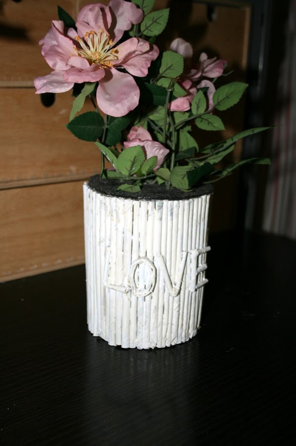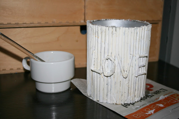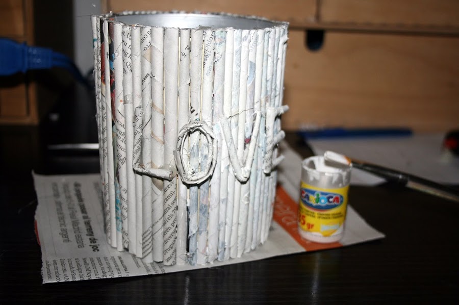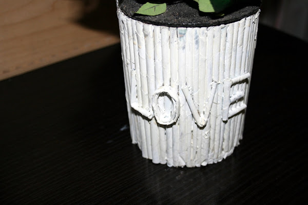 Y ahora podemos dejar libre la imaginación, a mi me apetecía utilizar la misma técnica del "rulito" para crear las palabras "LOVE", y con la pistola de silicona las enganchamos en el proyecto así: