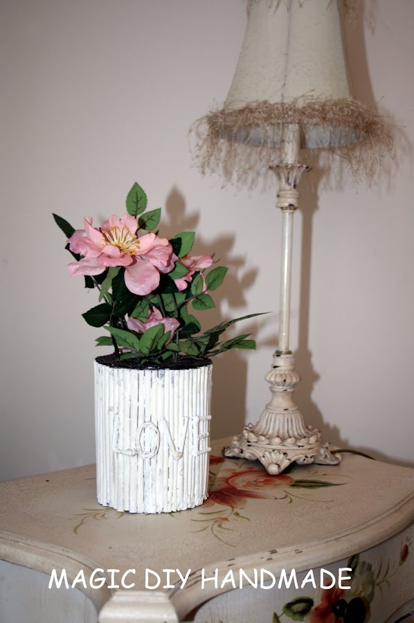 Cuando ya estuvo seco, reutilicé una maceta de flores artificiales que tenía por casa, y las puse en mi nuevo macetero, y creo que ha sido un acierto total! Igualmente podríamos utilizarlo con flores naturales, alguna planta sólo verde, o cualquier flor que le vaya bien a la decoración de vuestro hogar.