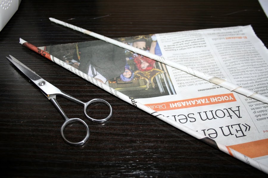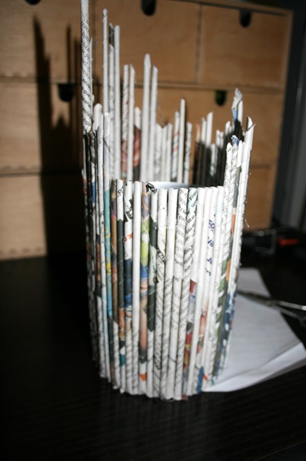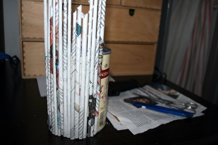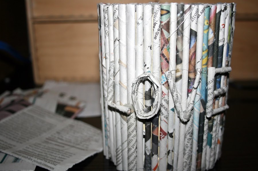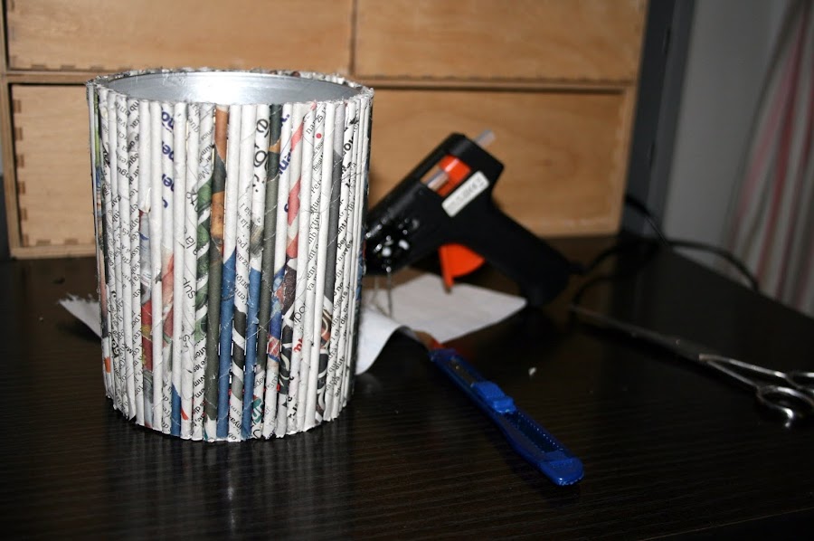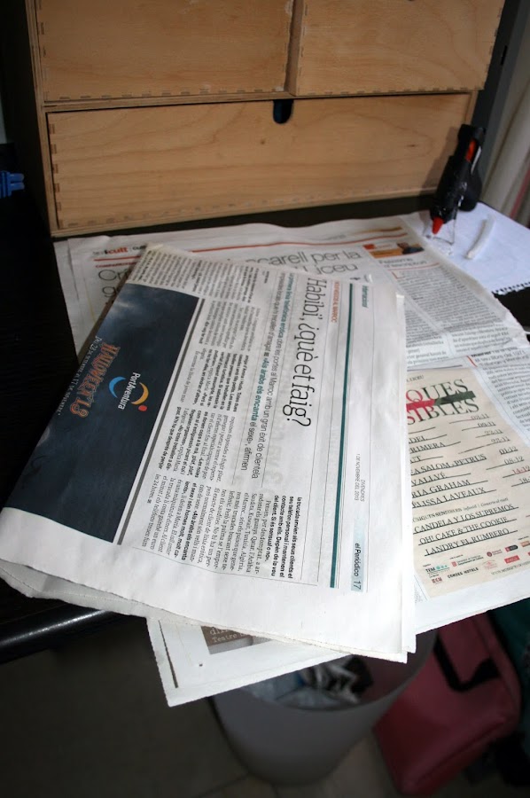 Para empezar hay que tener el bote bien limpio y seco, y empezamos cortando las hojas de periódico a un tamaño rectangular, yo las he cortado por la mitad dos veces: