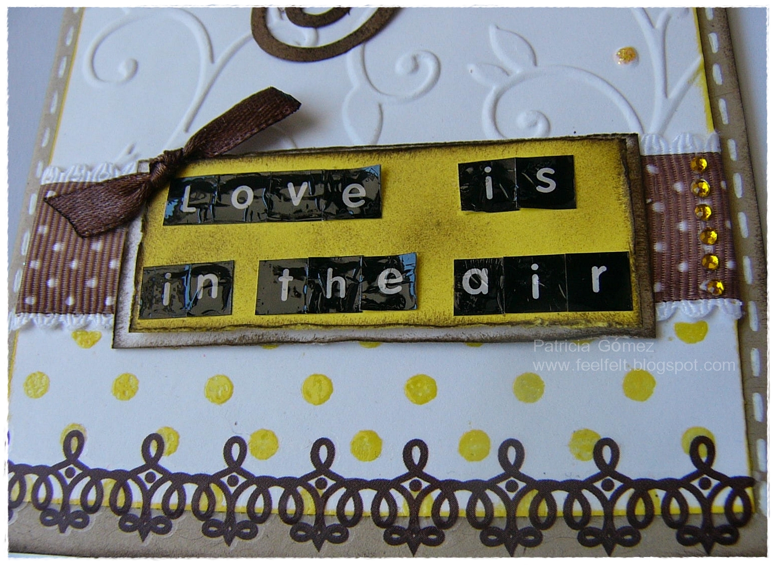 El papel blanco ha sido, en la parte superior embosado con la carpeta Cuttlebug Birds And Swirls, y en la inferior, estampado con el sello Dots de Stampabilities, embosado despues con polvos transparentes.