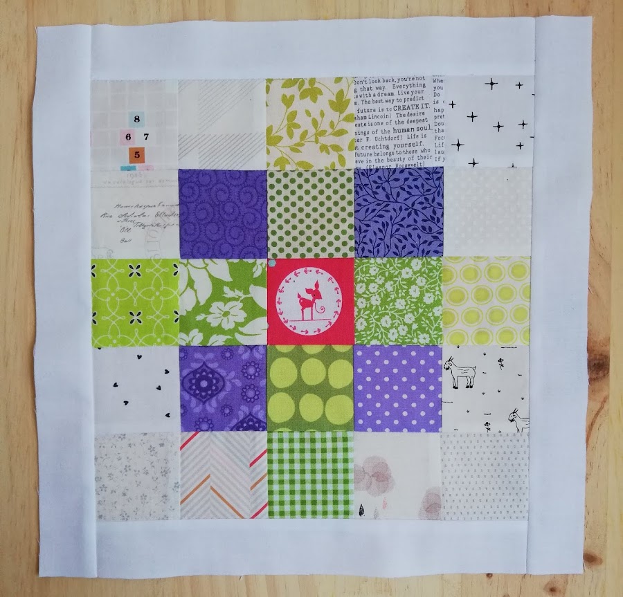 El cuadro central tenía que ser un motivo principal en rojo, naranja o amarillo. A su alrededor 4 telas en tonos violeta, y la cruz central en tonos verdes.