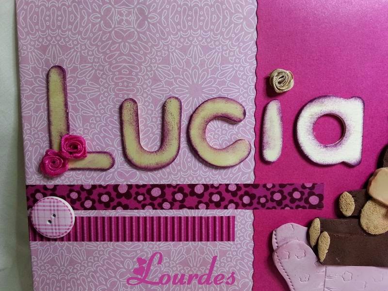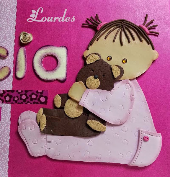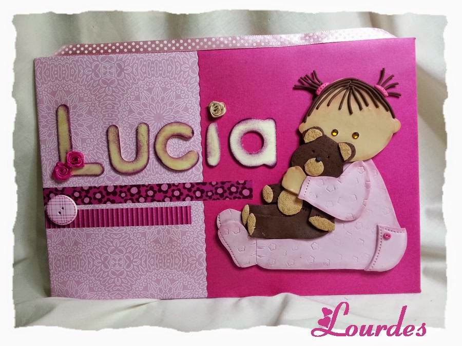 Cartel realizado para una habitación infantil, con el nombre personalizado. La niña está toda ella realizada en arcilla polimérica. No es una silueta Letras en madera decoradas con tintas y flores de arcilla polimérica Y flores de papel realizadas con diferentes papeles. El botón también es de arcilla polimérica. Un bonito detalle par regalar ¿verdad?