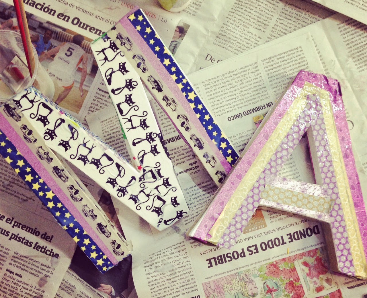 Nada más llegar los peques, que eran los protagonistas, tenían un kit de manualidades para estar todo el día decorando. Además de su delantal personalizado (repito... y repetiré hasta la saciedad.... Lorena se lo curró muchísimo) cada niño tenía su inicial y una bola de madera para decorar con los cientos de washitapes que tenían por las mesas. Cada uno la customizó a su gusto y en cuanto acababan, tenían otra actividad para hacer.