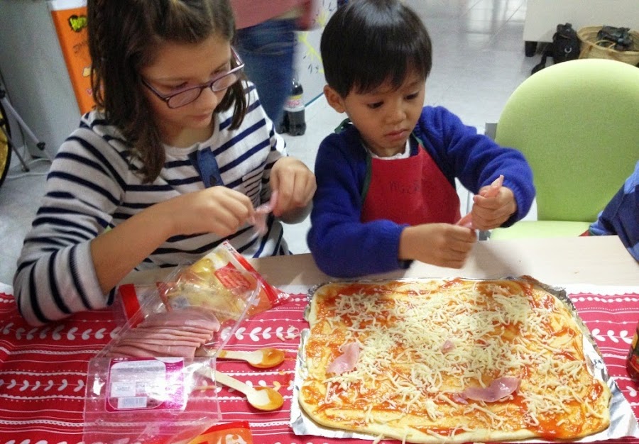 A la hora de la comida, ellos mismo se hicieron su pizza y la hornearon. Las mamis invitadas contribuimos llevando cada una algo de comer, pero sin duda, lo mejor fueron los postres...ricos, ricos...