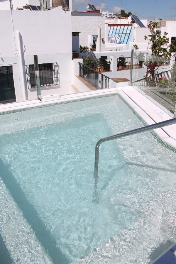 Hotel Almadraba , e s un pequeño hotelito justo en casco histórico de Conil de la Frontera , a los que le gusten los macro hoteles abstenerse , pero la verdad es que yo normalmente busco hoteles pequeños y con encanto y este no me ha defraudado. El edificio es una casa-patio muy típica de la zona que data del siglo XVIII. Este tiene 17 habitaciones a cual más bonita distribuidas alrededor de dos patios y una magnifica terraza con jacuzzi con vistas al mar ideal para relajarse.