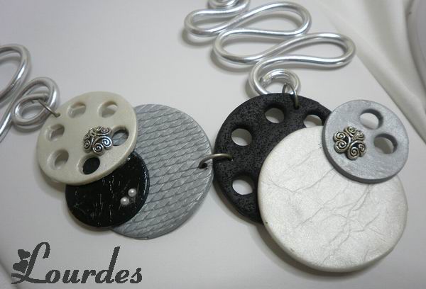 La pieza grande plata está realizada con una redecilla y la grande negra con cepillo de alambre