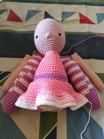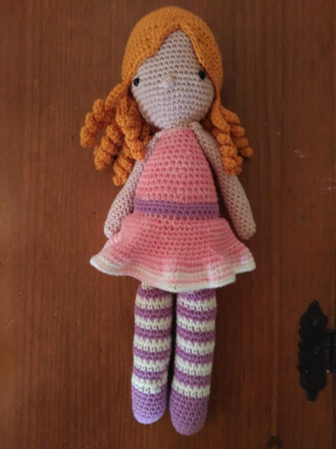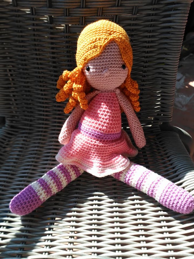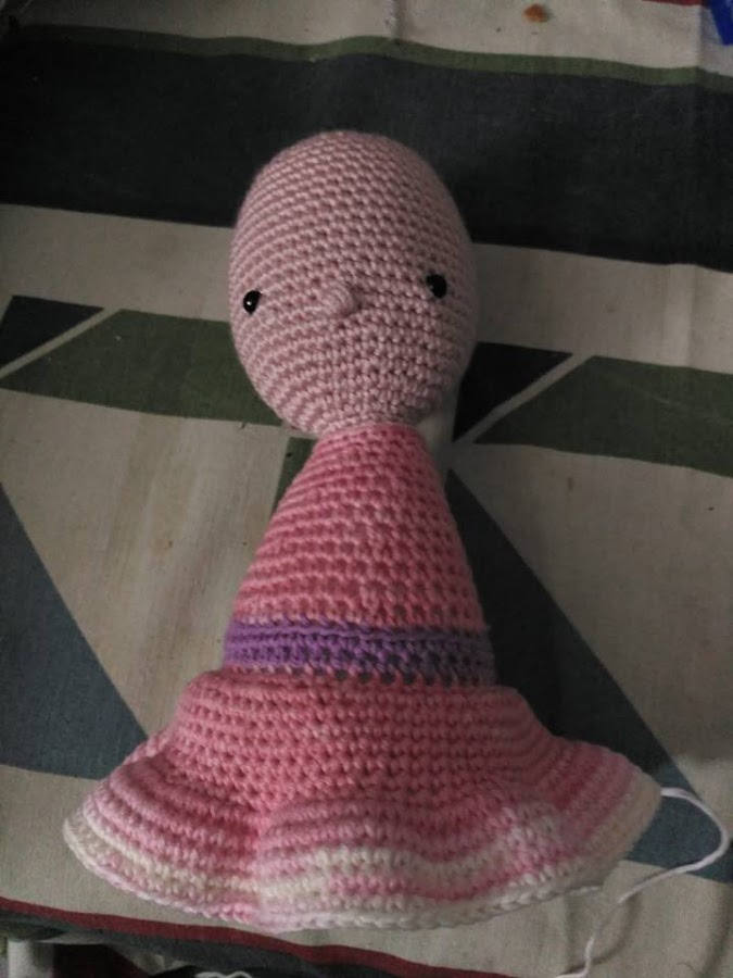 Cuando el trabajo es así, en una pieza hay que rellenar bien el cuello, ponerlo bien prieto para que sea estable la cabeza y no se caiga para los lados. Si no te gusta ponerle mucho relleno te puedes ayudar con algún palito que vaya desde el cuerpo a la cabeza y así hacerlo más estable. Pero con bastante relleno es suficiente. De hecho, así está esta muñeca, sólo con relleno.