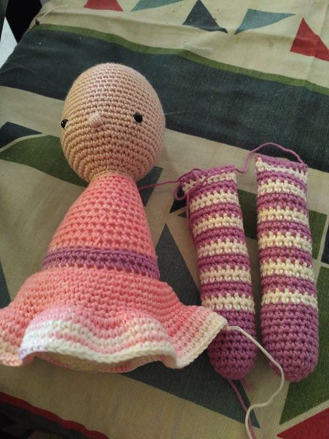 Lo siguiente a tejer son las piernas. El patrón recomienda las piernas de rayas, así lo he hecho yo. Pero claro, eso es siempre a gusto del que teje. Al igual que para la próxima que haga le voy a poner algún adorno en el filo del "zapato" (donde empieza la primera raya blanca). Eso será en la próxima, como he comentado.