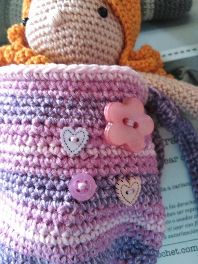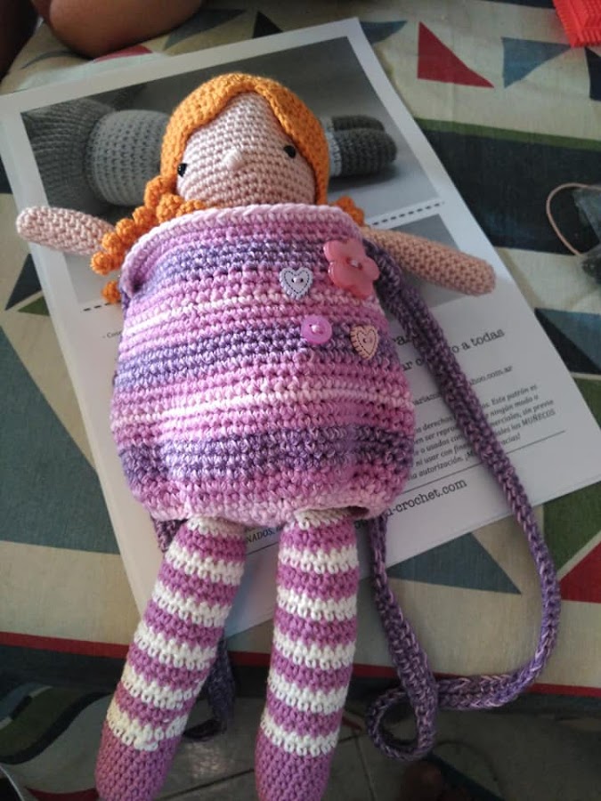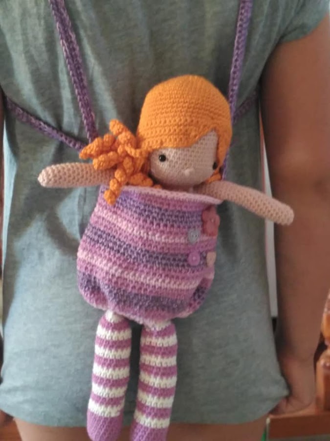 Esta muñeca queda preciosa así tal cual, pero el diseño trae incluida un bolso que se puede convertir en mochila para poder llevarla de paseo.