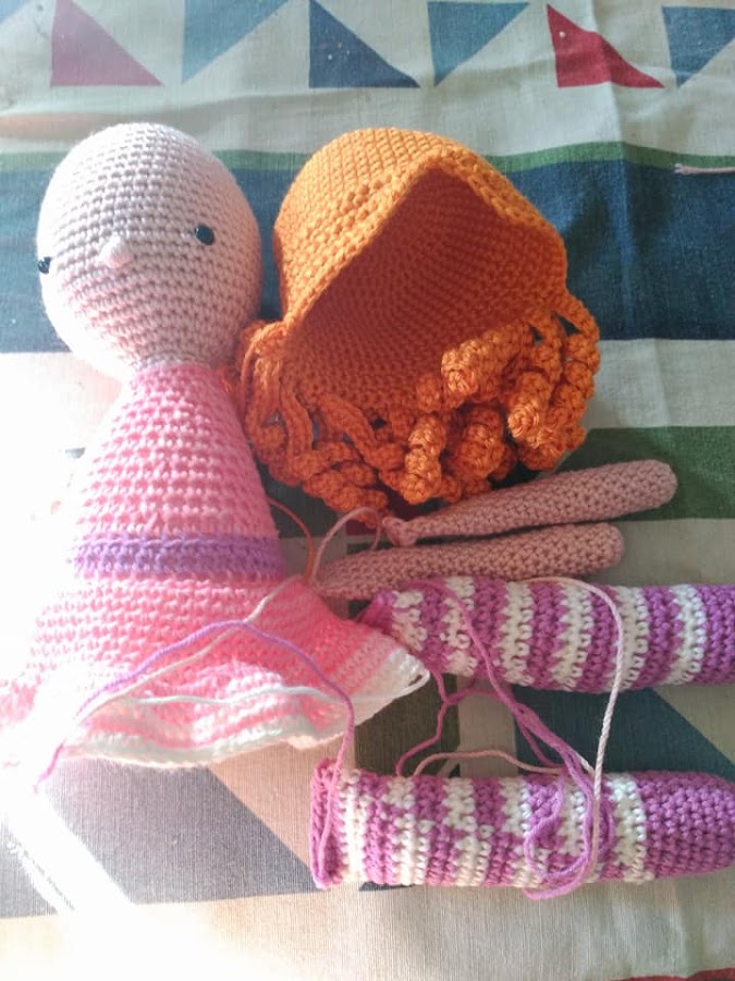 Como os habreis dado cuenta, el hilo del vestido de mi muñeca es matizado y empezó el blanco al final de la falda por eso las rayas son blancas, en teoría las piernas son del color del cinturón y el vestido.