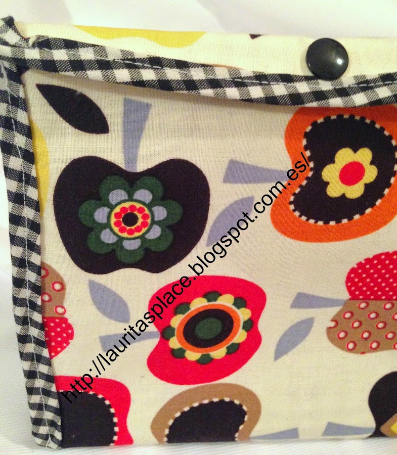 Le he puesto entretela gruesa y al coser a la máquina me ha costado un poco al unir las tapas de los laterales y la pieza central junto con el bies, sobre todo en las esquinas, pero en general la costura es sencilla.