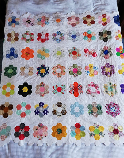 Y voy a necesitar muchos más hexágonos blancos, así que voy a estar entretenida un rato largo pero esta colcha es para disfrutar. Me lo recuerdo cada vez que la veo.