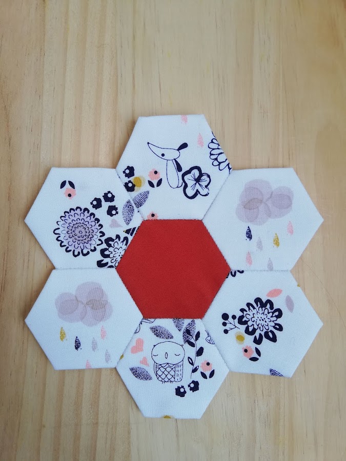 En este caso preparé los hexágonos a mi gusto para hacer esta flor. El perrito, el búho, la lluvia... me encanta.