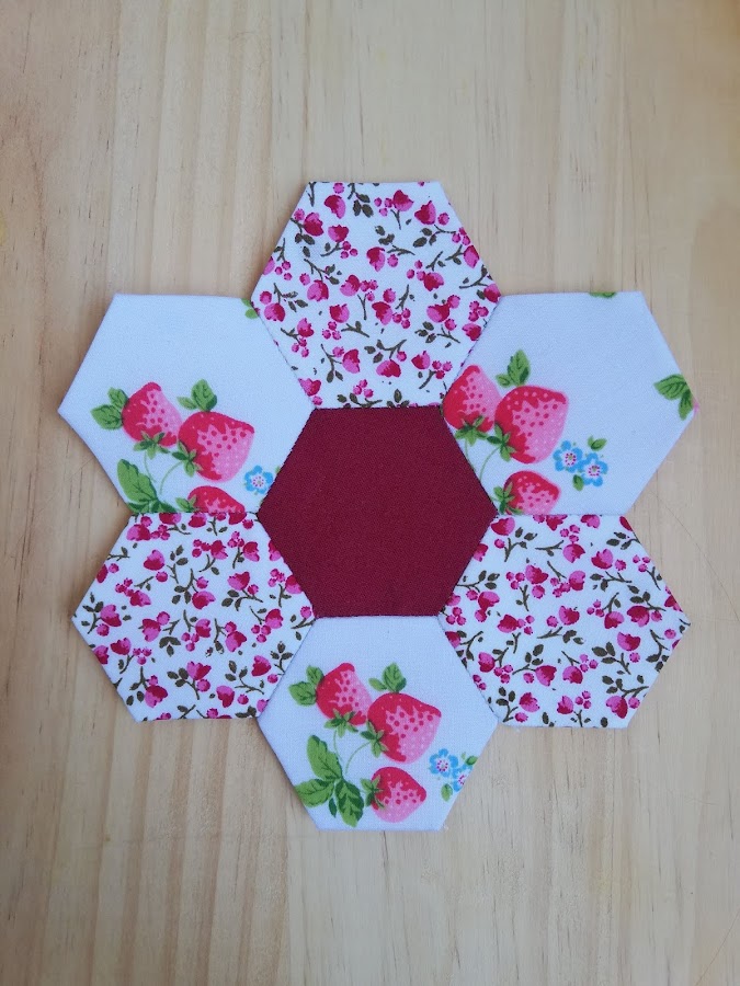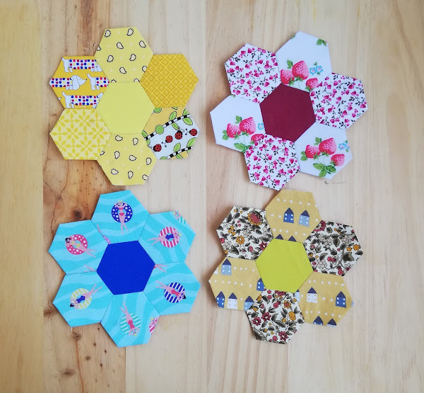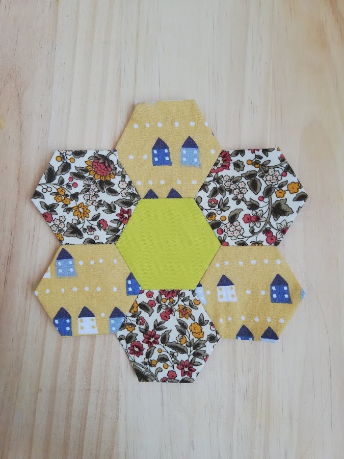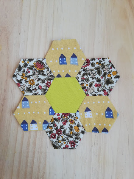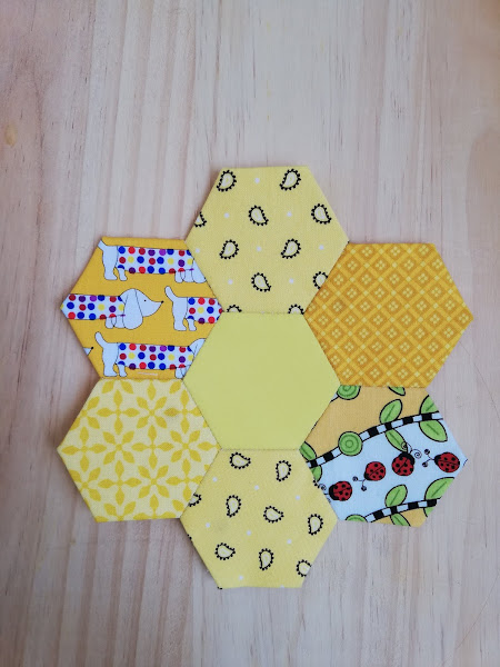 Y en esta flor he mezclado hexágonos en tonos amarillos.