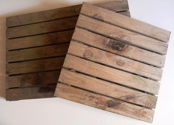Esta vez íbamos los dos, y vimos estos cuadrados de madera para suelo de jardín. Están bastante maltrechos, pero creo que quedarán estupendos