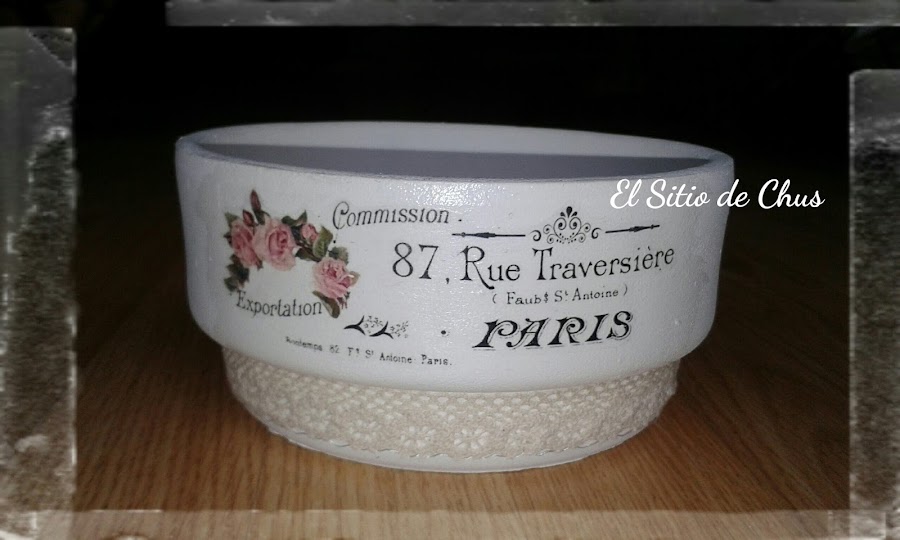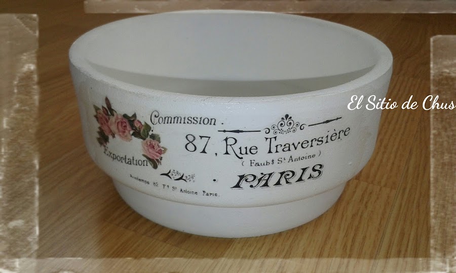 Primero la pinté de blanco con pintura a la tiza, pensé dejarla así, pero no! La encontraba sosa, así que decidí ponerle un par de transfer iguales, uno por delante y otro por de detrás. Quedó así: