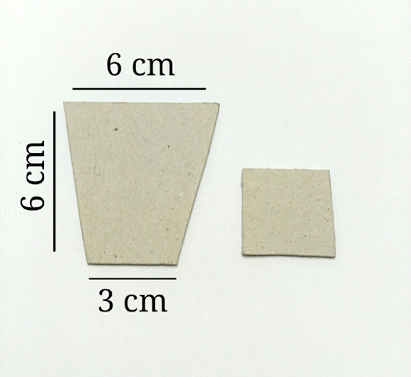 Cortamos 4 piezas de cartón de 6x6cm. En uno de los lados de cada cuadrado, hallamos la mitad, y la mitad de la mitad. Es decir, nos tiene que quedar una base central de 3cm. La figura que nos sale es una especie de trapecio isosceles.