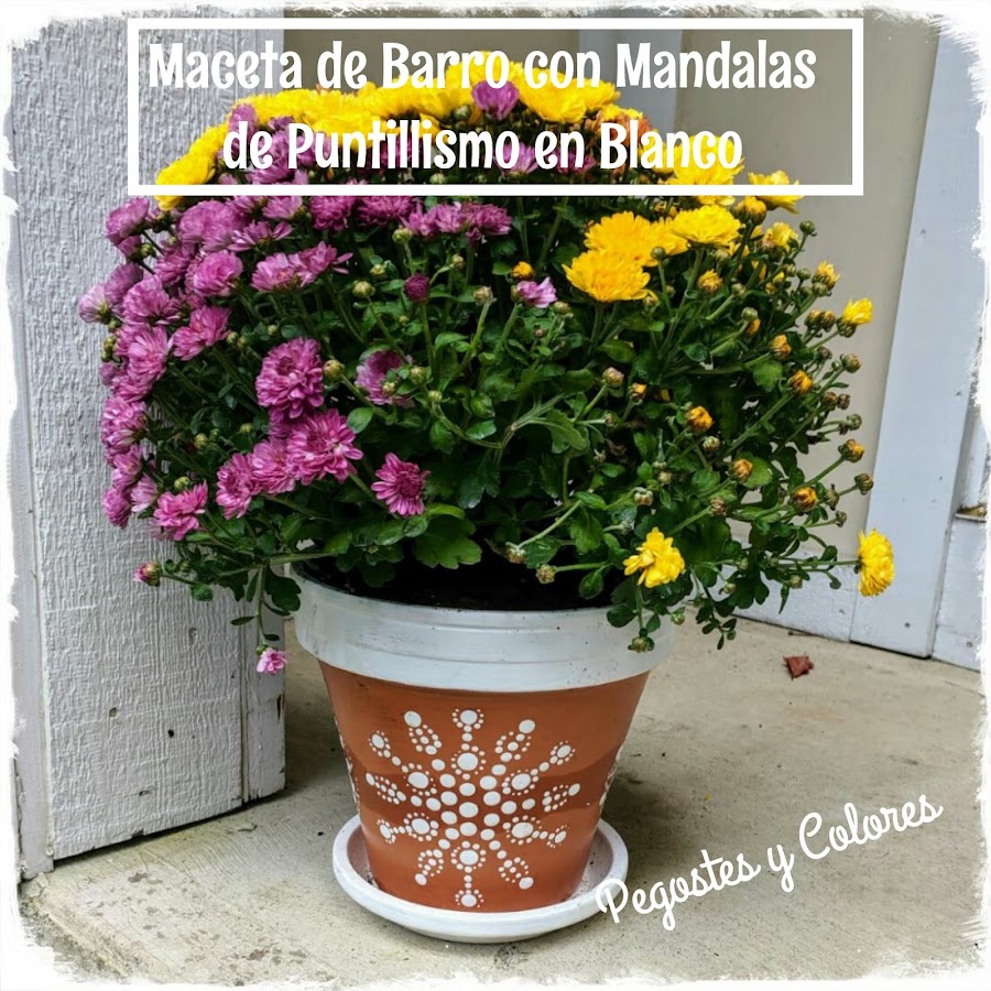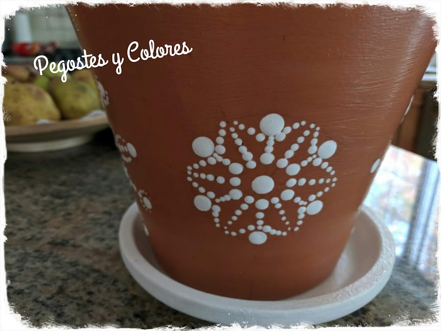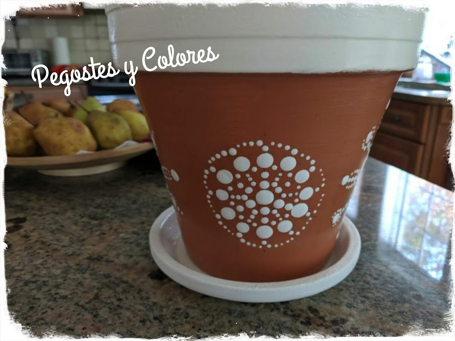 Vi unas macetas preciosas decoradas con mandalas de puntillismo y así quise mi maceta para mis crisantemos, pero decidí que lo haría solamente usando el color blanco. Esto porque no quería que el color de las flores chocara con el color de los puntos y fuera demasiado. Quería algo que combinara con todo.
