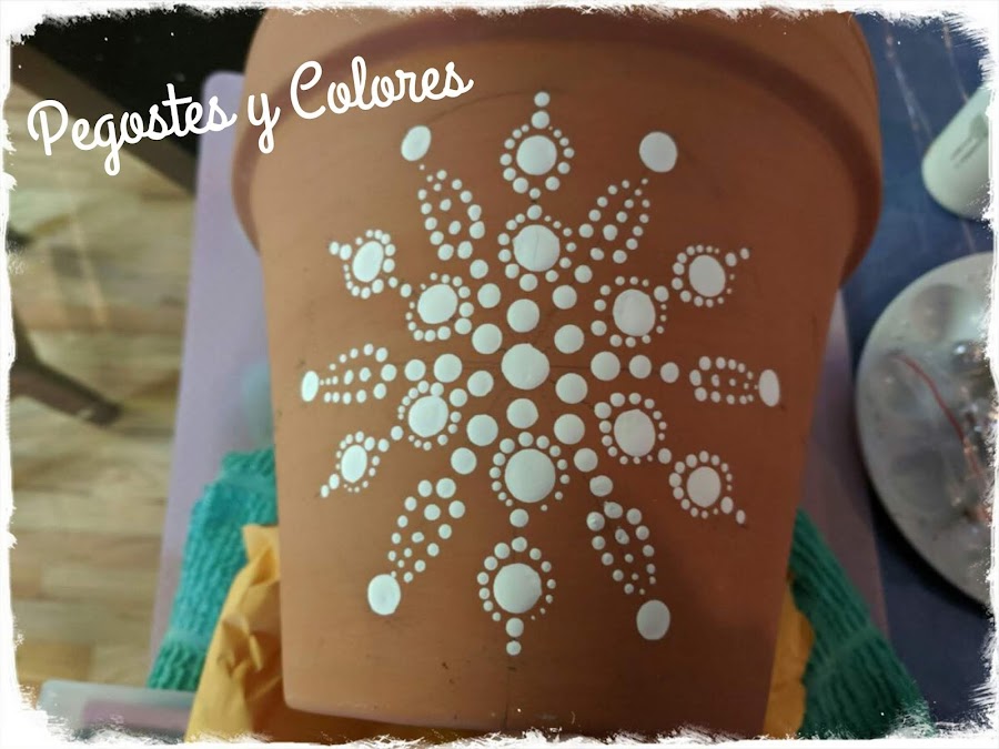 2.- Fui haciendo lo que sentía, pero comencé con los puntos mas grandes en el centro y de ahí me fui creando el diseño. Es mejor que la pintura sea espesa, y recargar la maceta sobre trapos para nivelarla y que la inclinación que tiene la maceta quede mas o menos plana. Esto para que no escurra pintura y nos queden óvalos en vez de círculos, porque estamos trabajando con una superficie curva.
