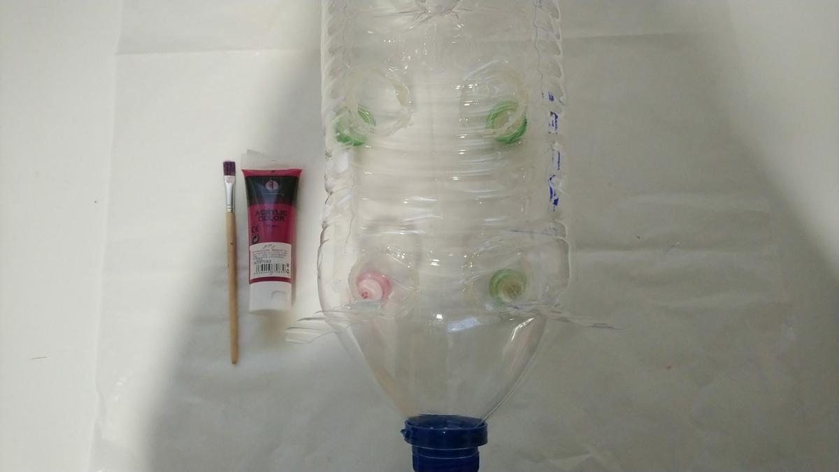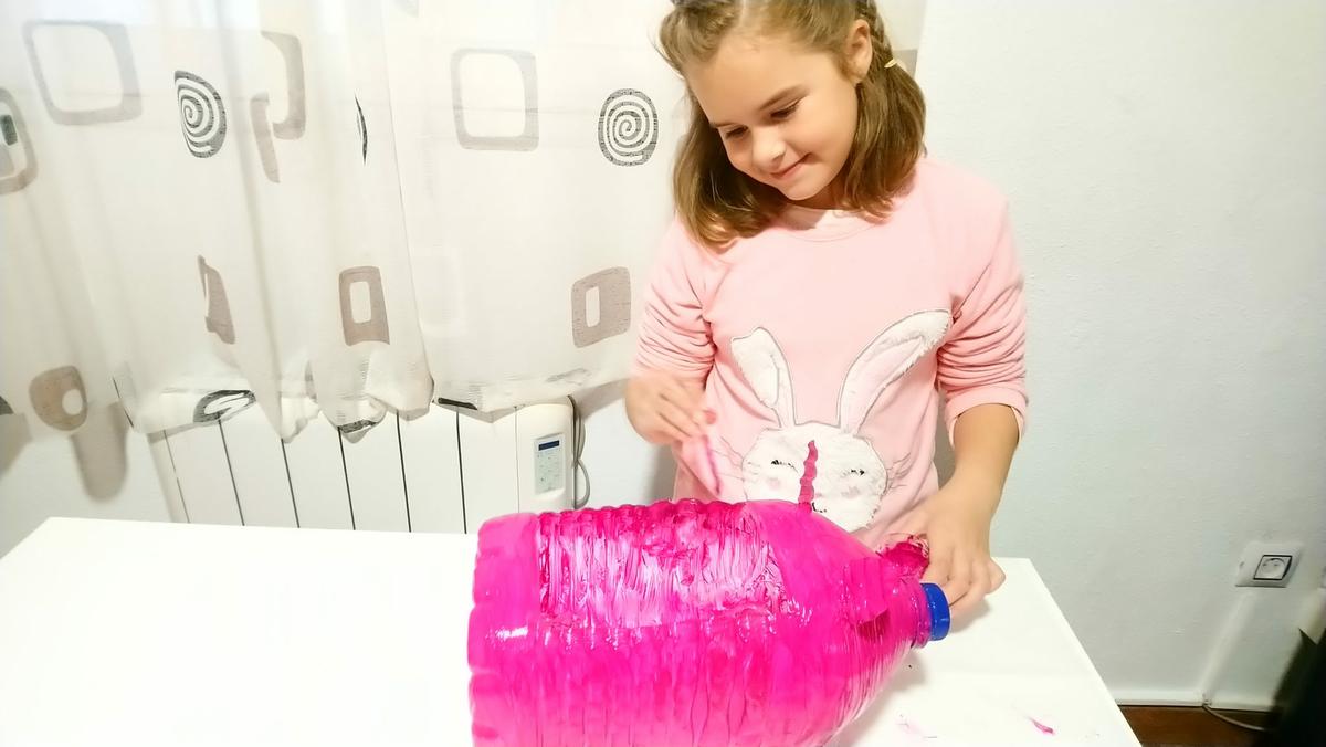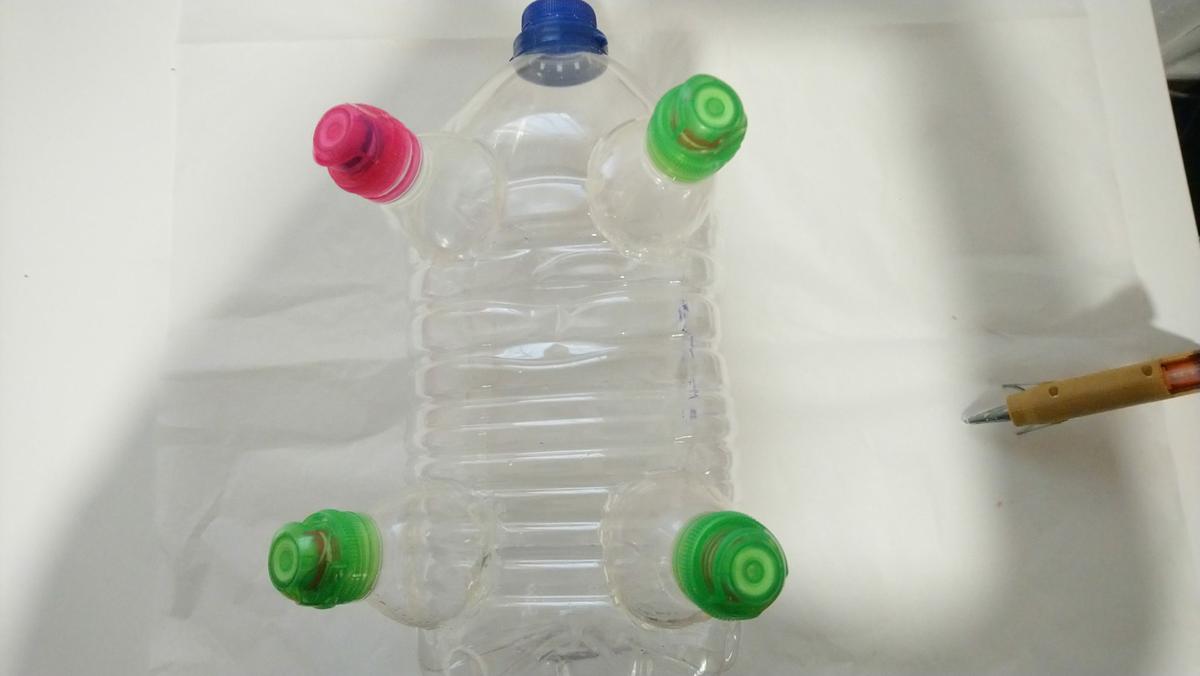 Después, con la silicona caliente, hemos pegado las mitades de botellitas en la botella grande, que son las patitas de nuestro cerdito: