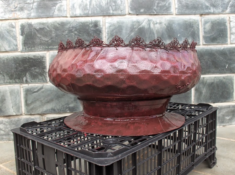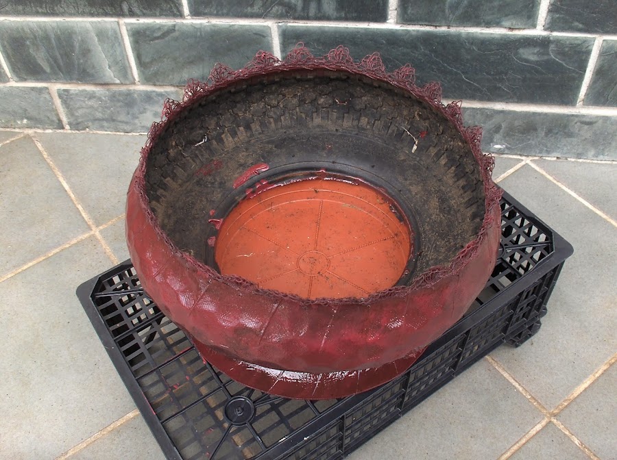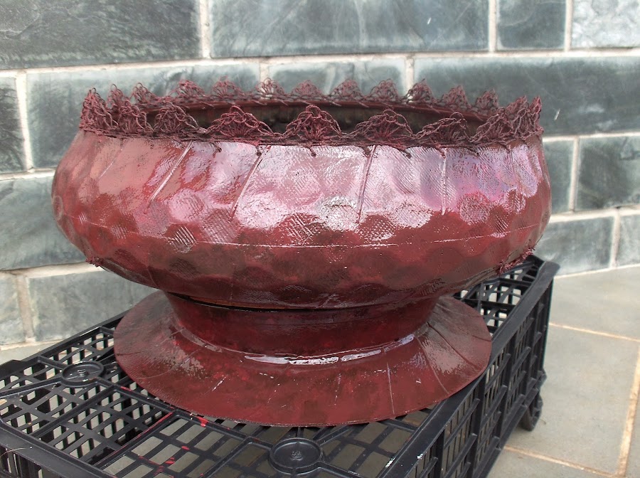 para simular tipo copa, le puse un plato de plástico de maceta y de base el lateral que previamente había cortado y quitado.