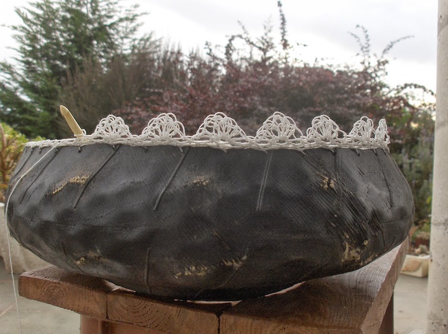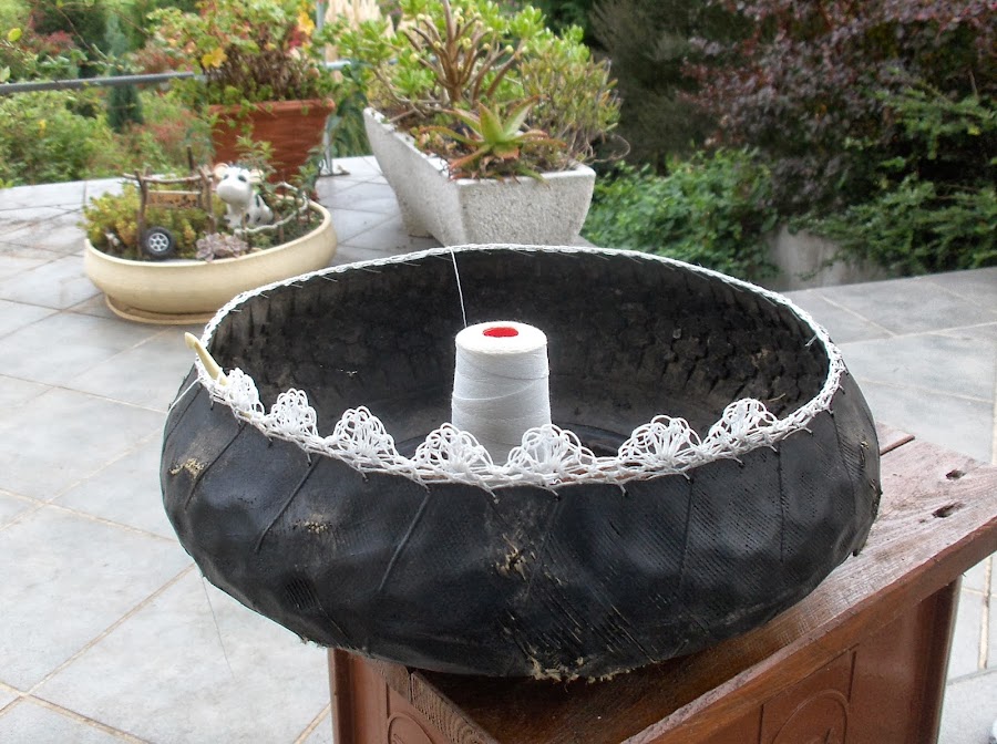 con el mini taladro Dremel, le hice unos agujeros para pasar el hilo y comenzar con una puntilla, que posteriormente al pintar con esmalte, queda totalmente firme y dura.