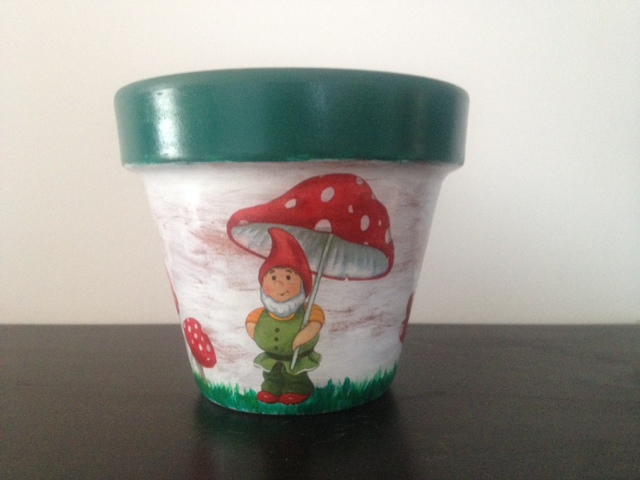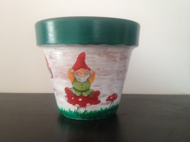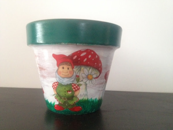 Es una maceta pintada en acrilicos y decorada con decoupage.