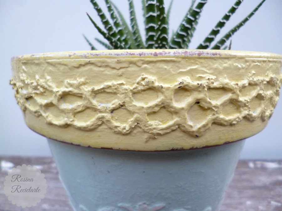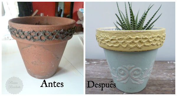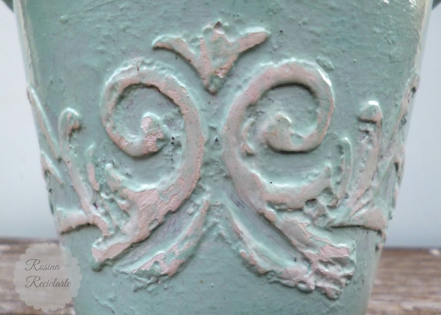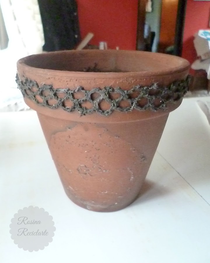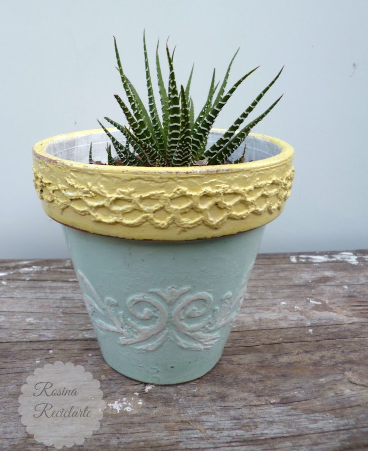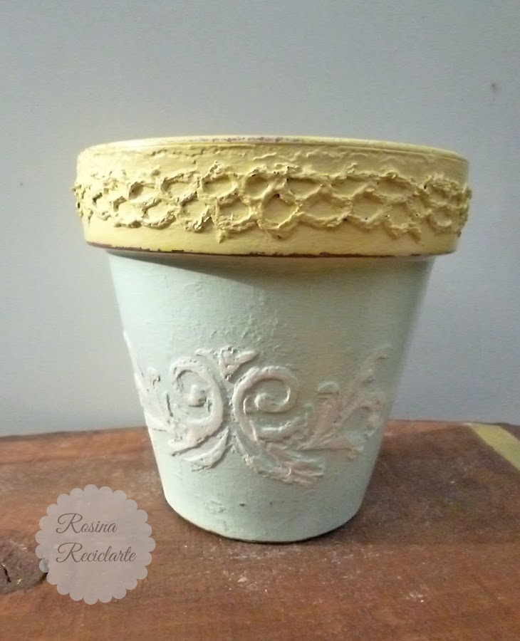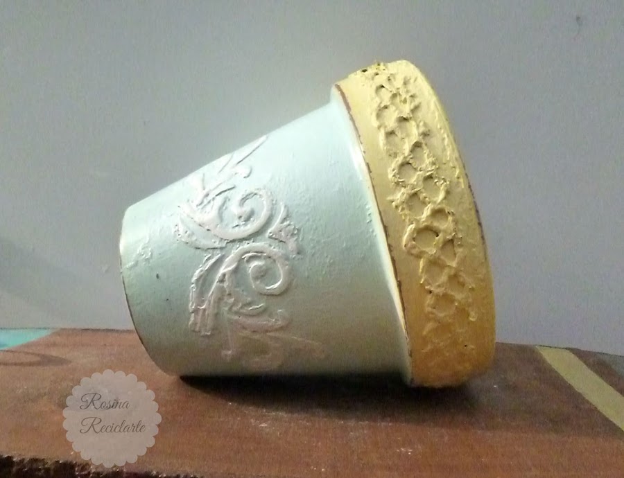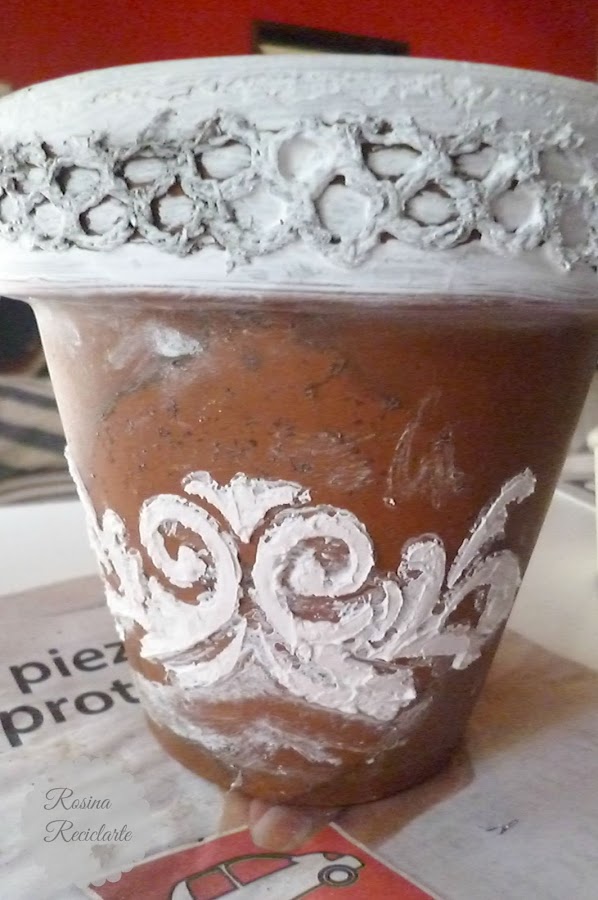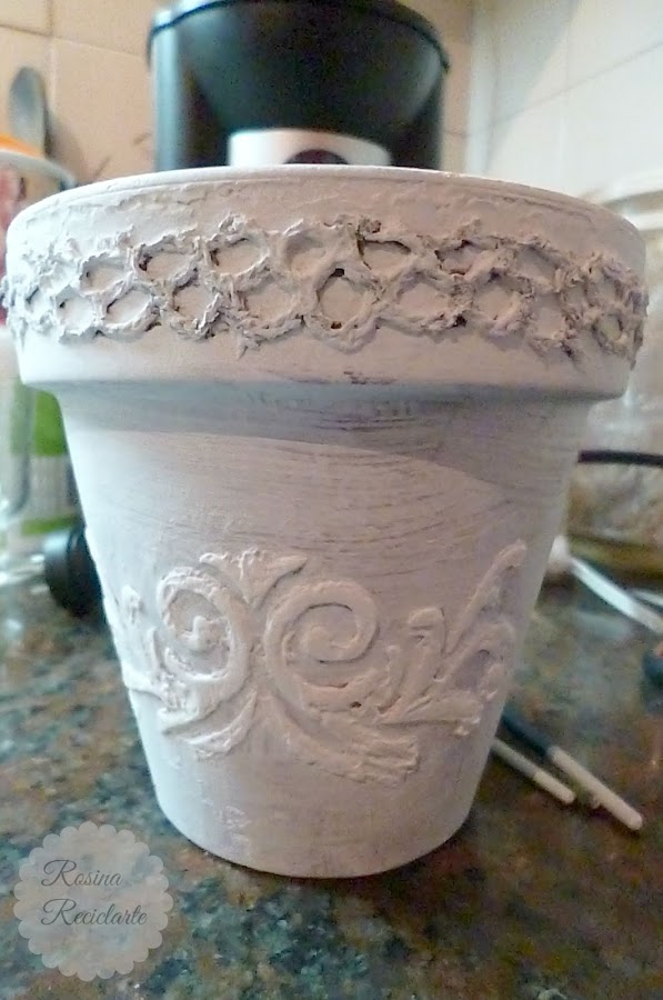Una vez seco el enduído(unos 30 minutos si la ponés en el sol) base blanca a toda la maceta.