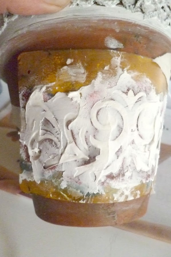 Como me fue imposible sacarle la puntilla del borde y los restos de pegamento,no me quedó otra que dejarlos y disimular el frente con enduído y stencil.