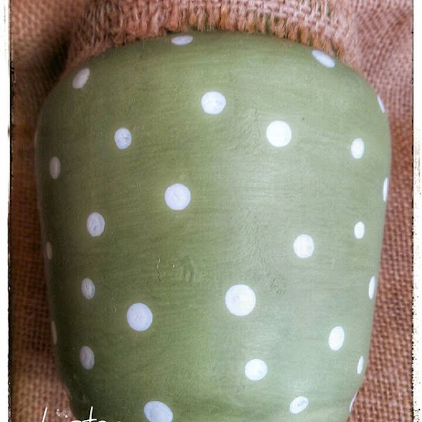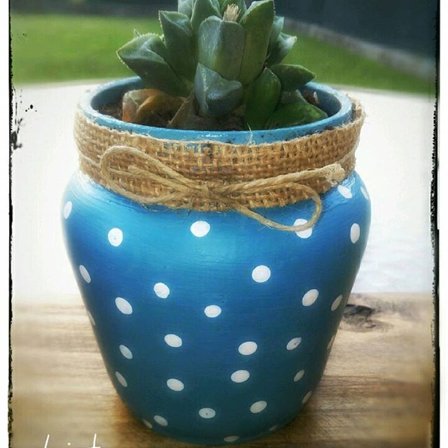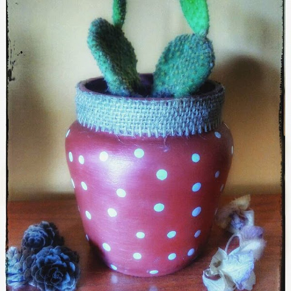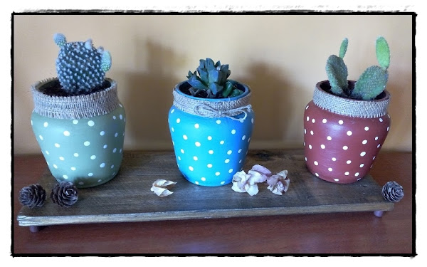 Una capa de cera incolora, para protegerlos y un adorno de arpillería en la parte superior, pegada con cola blanca y listo...ya tenemos nuestros recipientes para pequeñas plantas.