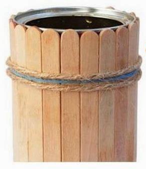 Pega los palitos de madera sobre la lata, estas tienen que estar bien juntas, mantenlas bien pegadas, luego realiza un amarre flojo en todo el contorno de la lata reciclada, sujetando los palitos que acabas de pegar.
