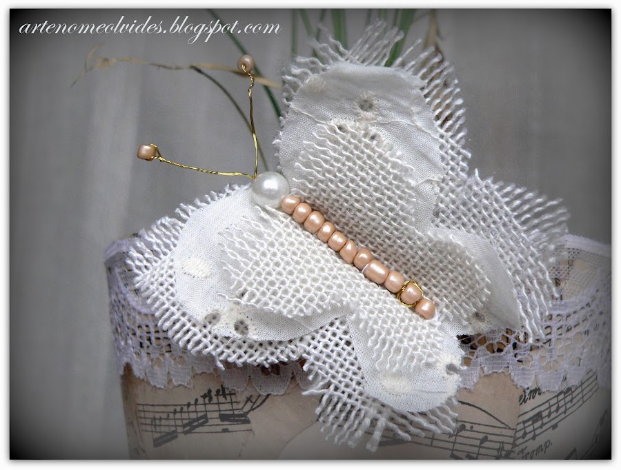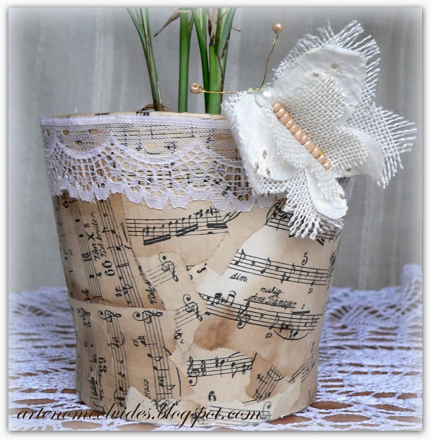 W ko?cu zrobi?am mój pierwszy transfer na materiale, teraz czas na poduszki, haha! Oczywi?cie nie mog?o zabrakn?? motylków, które zawsze gdzie? tam dodaj? do moich prac. Wykorzysta?am stare fotokopie nut i pociapa?am je kaw?, pozosta?e materia?y to stare zas?ony, spódnica, troch? sznurka, koraliki. Niestety moje kwiatki nie wyrazi?y zbytniego zadowolenia z powodu zmiany doniczek i wci?? choruj?:/, mo?e jak zmieni? mieszkanie?...