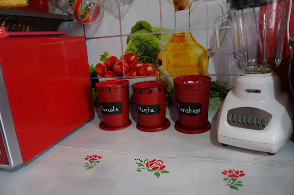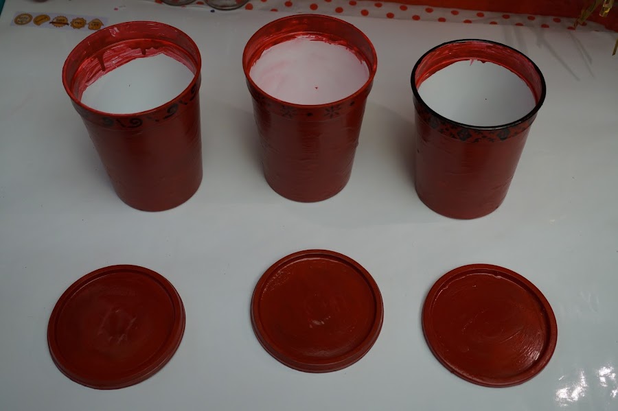 Después pintamos tanto las tapas como los envases, puedes utilizar pintura en spray o esmalte, si usas esmalte, rebájalo con thinner.