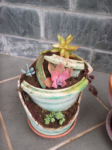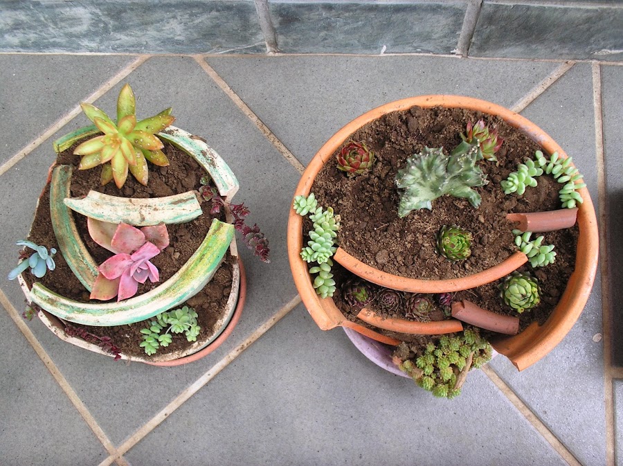 macetas rotas con suculentas