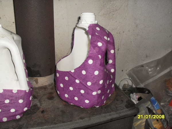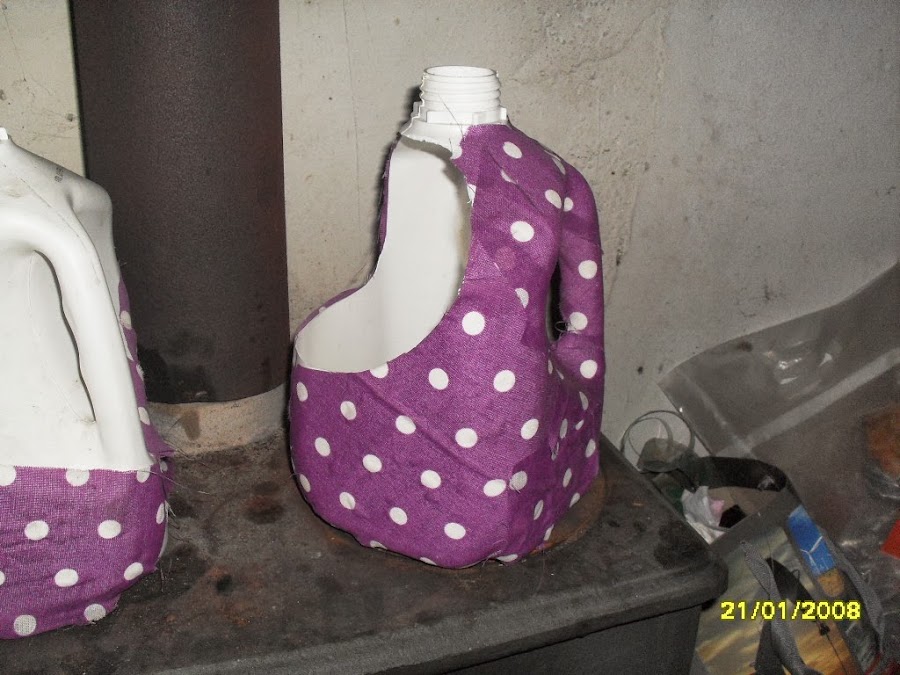 Para la técnica del entelado solo fui recubriendo con un pincel y plasticola blanca, la que usan los chicos en la escuela y la tela la corte muy irregularmente, para que se noten que eran retazo y así no tener que preocuparme de que quede como si fuese una pieza entera. Lo mas complicado fue la parte de la manija pero con un poco de maña sale, a no deseperar.