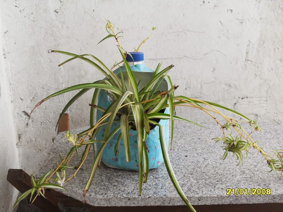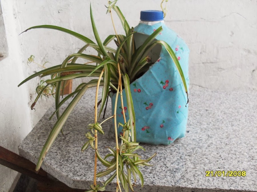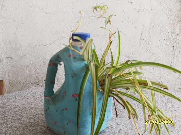 Son unas macetas cuyo proyecto final no termine, aun. Están hechas con unos bidones de 3 litros, solo hice un agujero central por donde meter las plantas y finalmente unos orificios de drenaje, todo con un clavo caliente y mucho cuidado!!