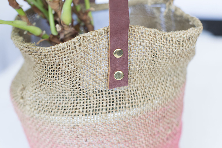 Este macetero colgante está hecho con tela de un saco viejo que compré una vez, y con el que tapicé esta silla. Y para colgarlo he utilizado una cinta de cuero que andaba por casa.