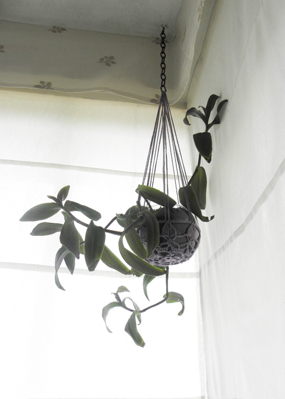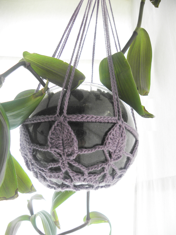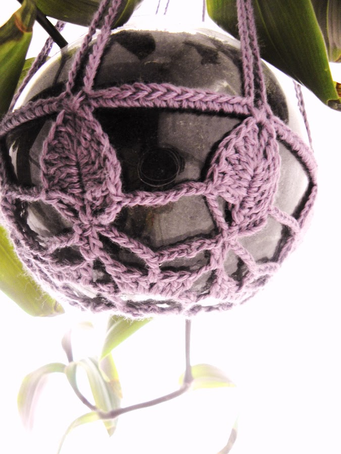 Como veis el macetero es un aplique redondo de ganchillo que en la última vuelta le he quitado cadenetas para que cierre y unas tiras dobles de cadeneta para colgarlo.