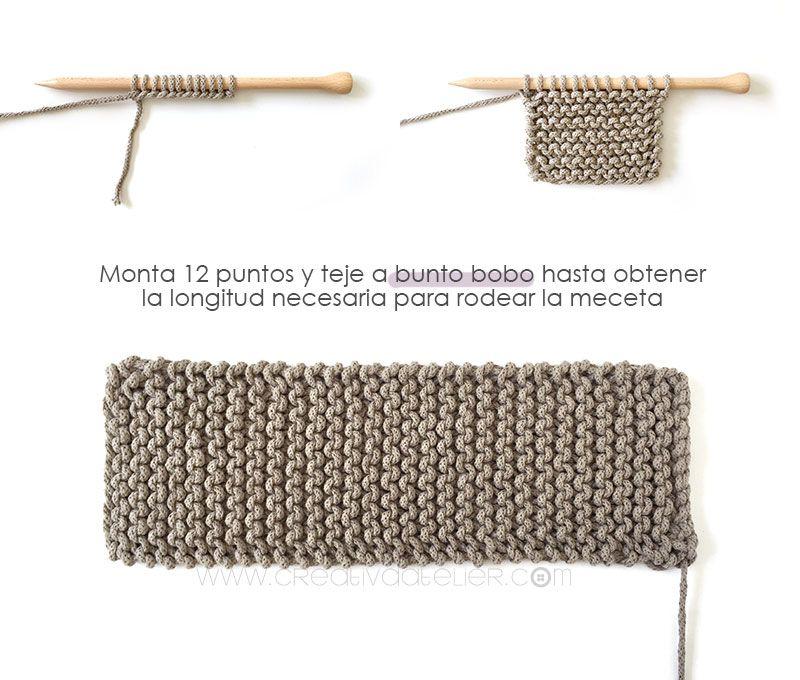 Con las agujas de punto, monta los puntos que estimes necesarios para cubrir la altura del macetero. En mi caso, que estoy utilizando un material bastante grueso, he necesitado 12 puntos.Si decides hacer la unión con aguja lanera, ten en cuenta que a la hora de cortar la hebra debes dejar una longitud suficiente para hacer esta costura y coser también el cuerpo a la base. ¡Más vale que sobre a que falte!.