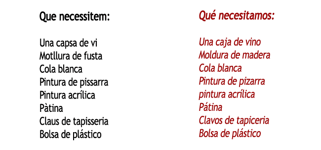 Amb la tapa de la capsa de vi tallem tres rectangles. La mida pot variar en funció de la capsa, però hem de tenir en compte que hi càpiguen al lateral. Els pintem amb pintura de pissarra.