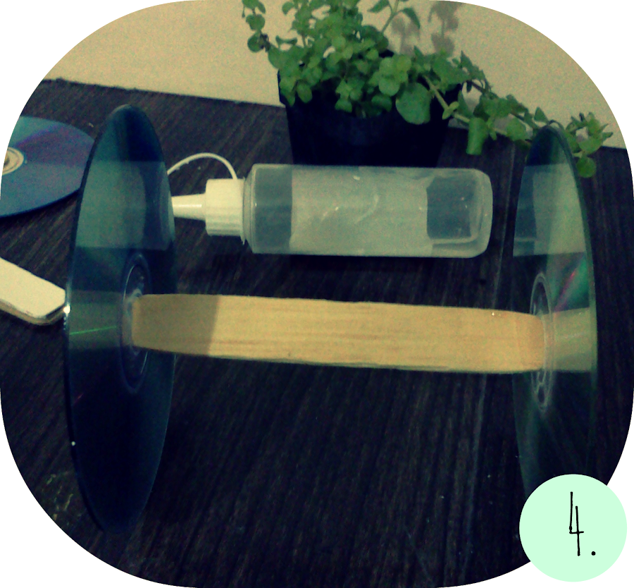 Como mis palitos de madera son redonditos de las puntas con una lija los achate por asi decirlo,y pegue por los dos lados de uno de los cd"s ...