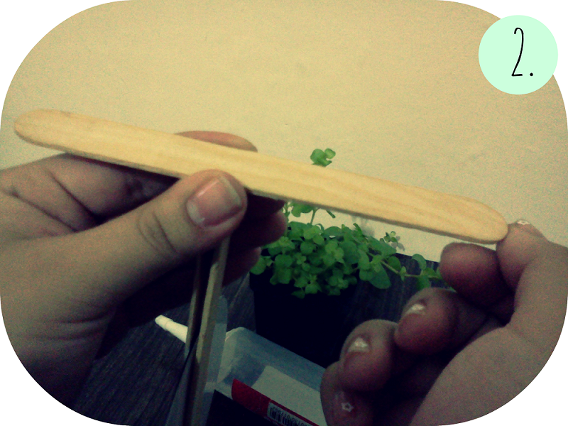 Vamos a pegar otros dos palitos que seran el soporte de el macetero como se ve aqui...