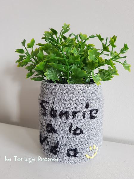 El fin es llenar con mensajes nuestros tejidos, y, como dice este macetero: "SONRIE A LA VIDA" me parece una frase genial y poco a poco iré haciendo más.