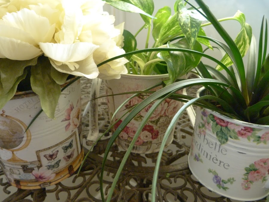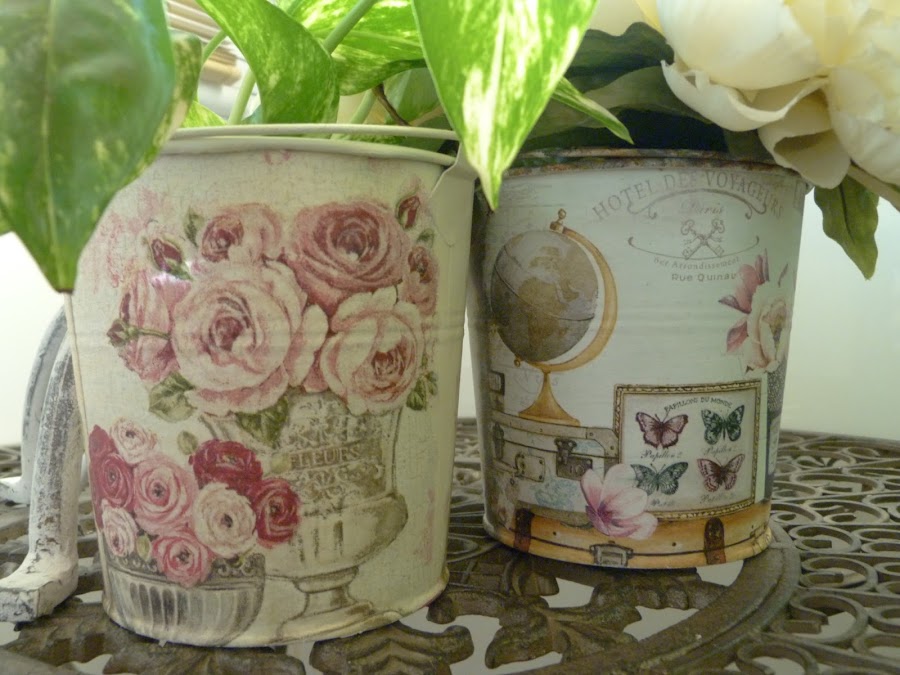 El procedimiento que he seguido en todos ellos ha sido aplicar imprimación para conseguir una mejor adherencia y menos capas posteriores de pintura, pintar con el color de base, y finalmente realizar el decoupage de diferente forma en cada caso. Si pincháis aquí, lo podéis ver con todo detalle en un macetero que os enseñé hace un tiempo.