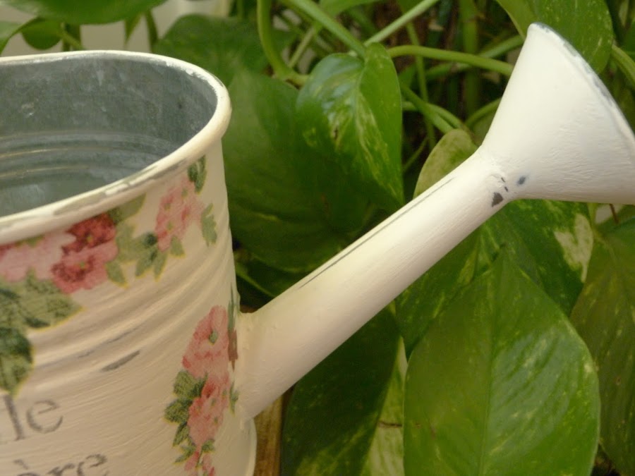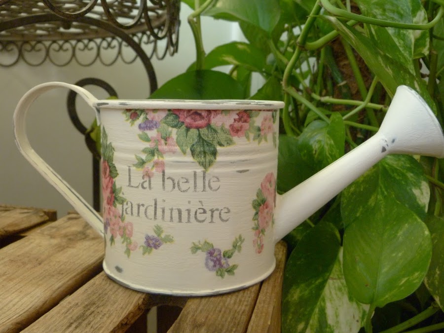 Por último, la regadera también está decorada con servilleta, pero en este caso, con motivos sueltos. En los tres he lijado la pintura después de aplicarla para que quedara más uniforme y suave, por supuesto, pero en este caso he lijado más en ciertas zonas para desgastar la pintura y dejar ver el zinc. Por último, un estarcido.